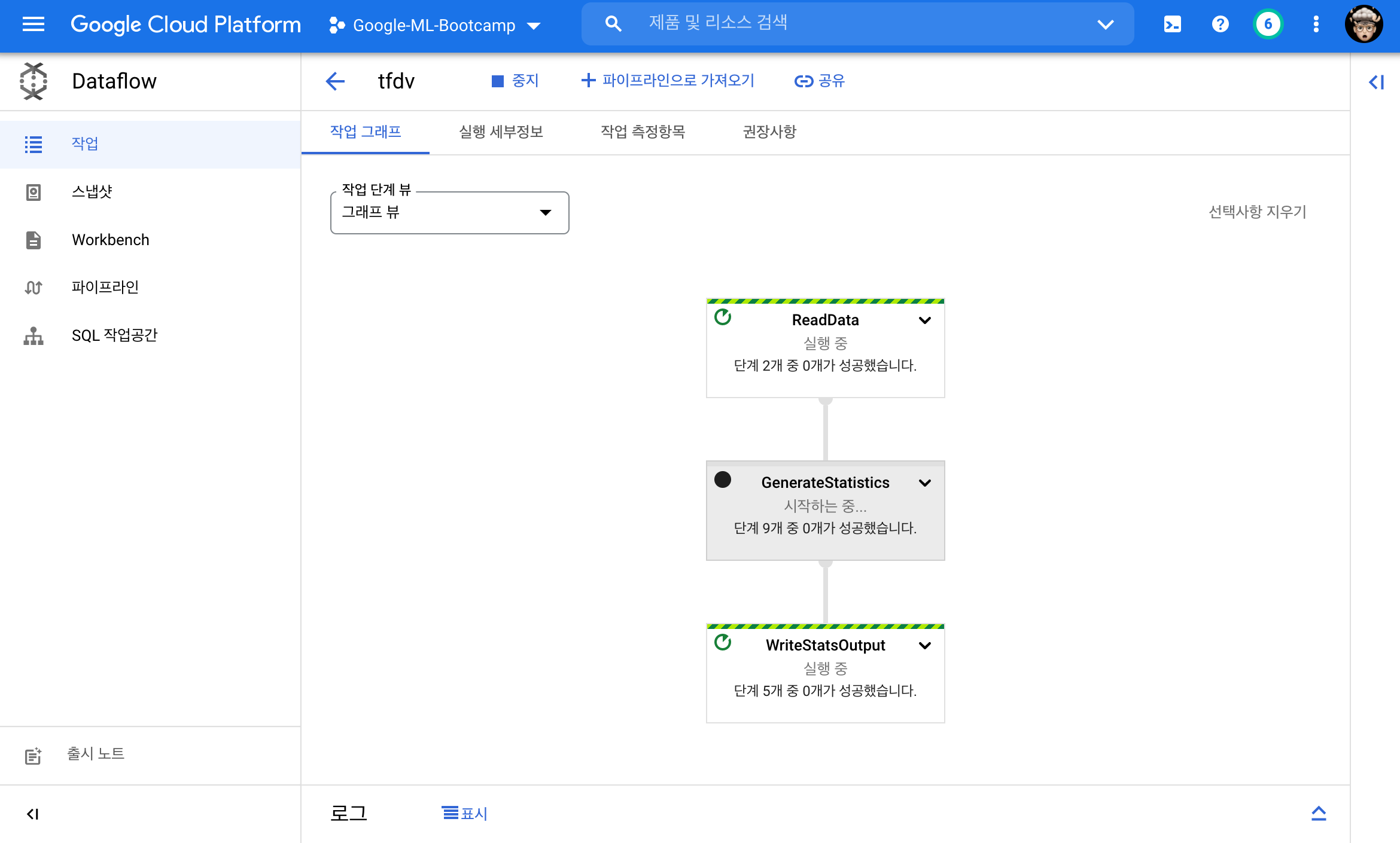 (인증 작업 후에) 다음 코드를 통해서 로컬에서 GCP Dataflow에 데이터 검증 작업을 요청할 수 있다. 작업은 GCP 인스턴스에서 실행된다.
