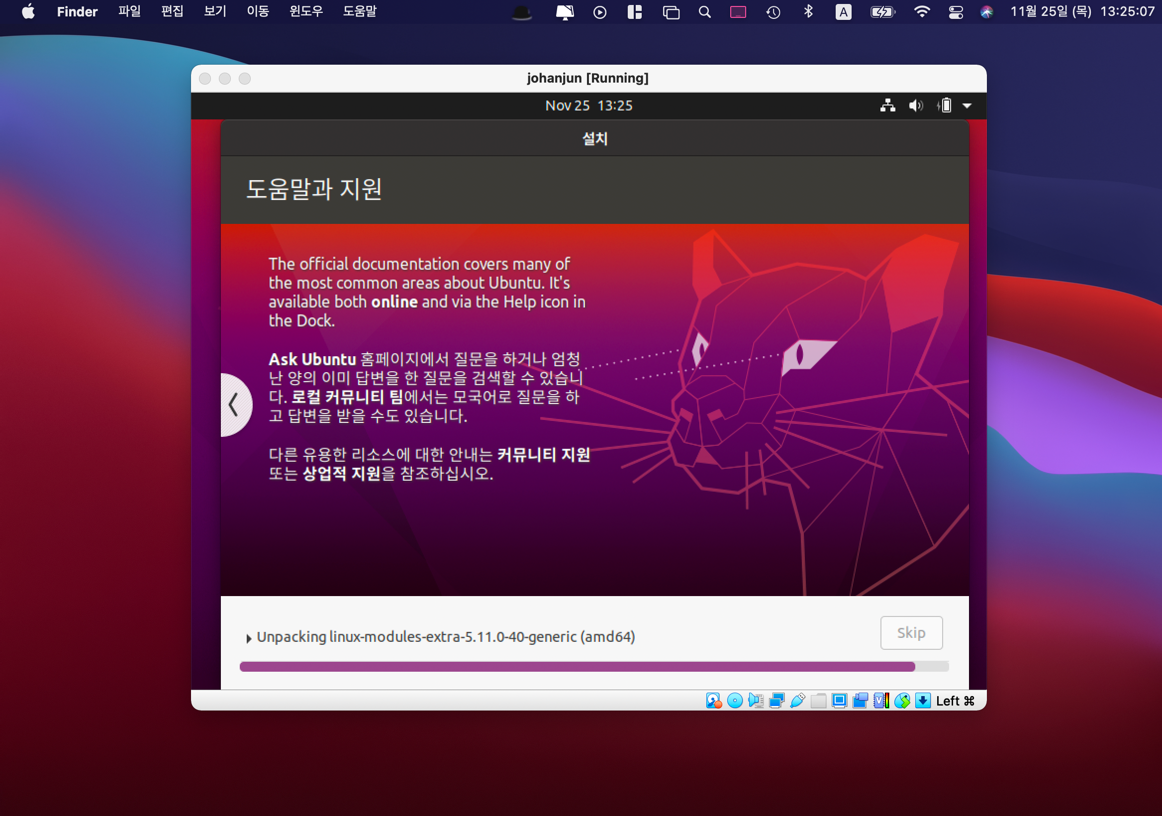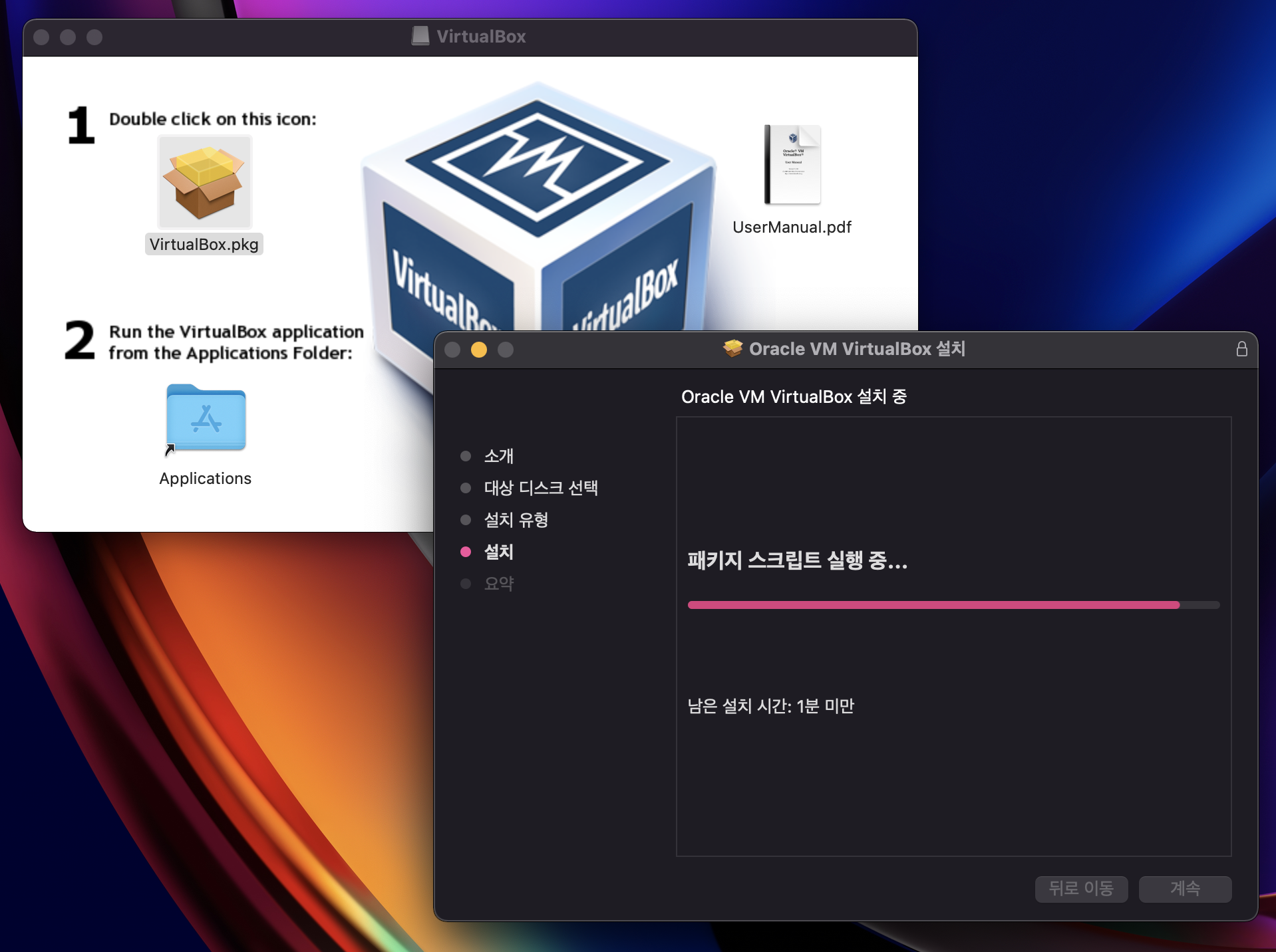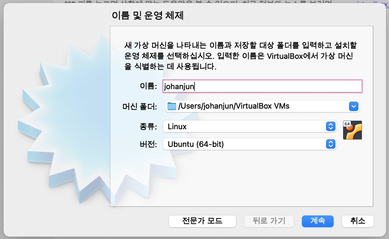 VirtualBox를 실행하고 새로 만들기를 선택한 후, 아래의 절차를 거친다.