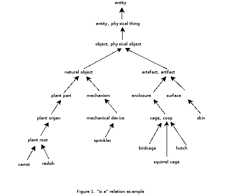 단어의 형태는 카테고리 형태이지만, 실제로 우리가 생각할 때에는 계층적으로 의미 구조를 지닌다. 따라서 단어들 혹은 문장들 간 '유사한가, 반대인가' 등의 개념이 들어간다. 계층적이라는 말은 카테고리화 할 수 있다는 의미이다. 예를 들면 색(Color)은 Hypernym이라면, 빨강(Red)은 Hyponym으로 색의 하위 카테고리에 속한다.