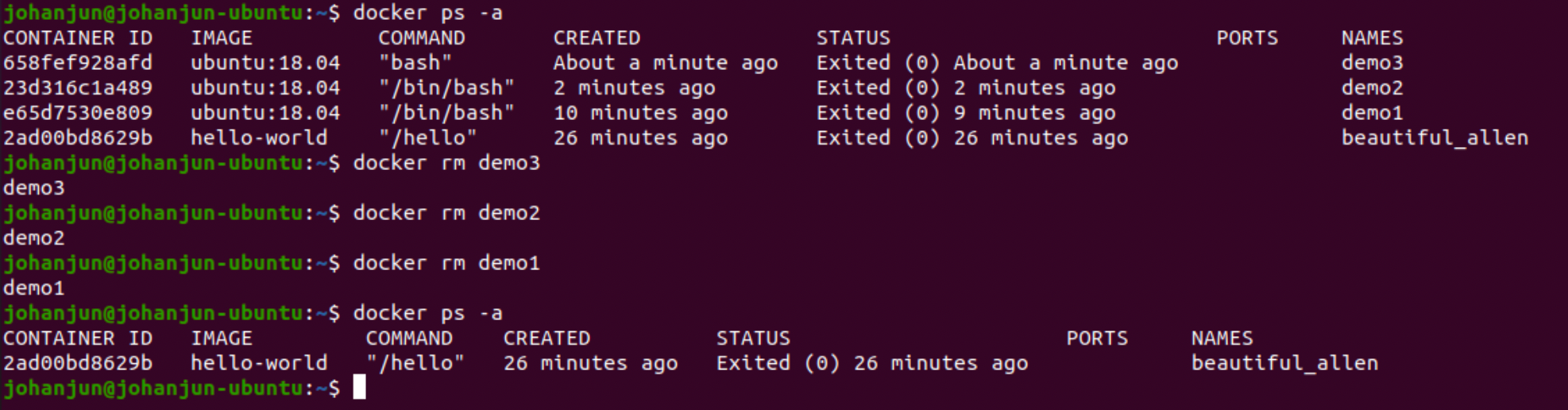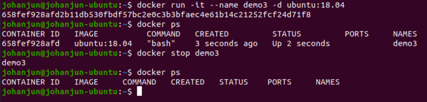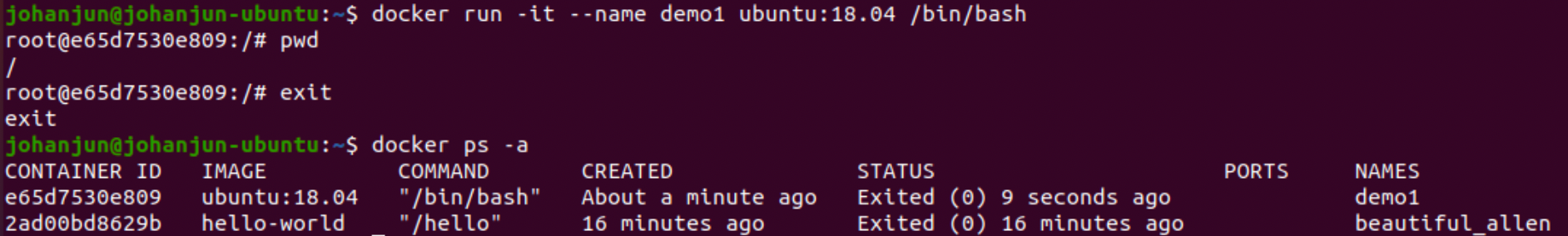 $ docker run -it --name demo1 ubuntu:18.04 /bin/bash