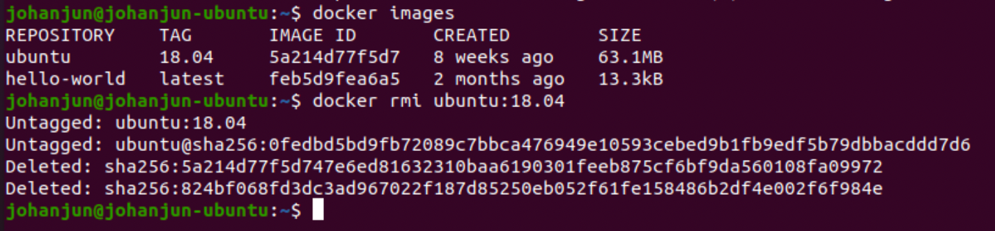 다운받은 도커 이미지를 삭제하려면 rmi(remove image)명령어를 사용하면 된다.