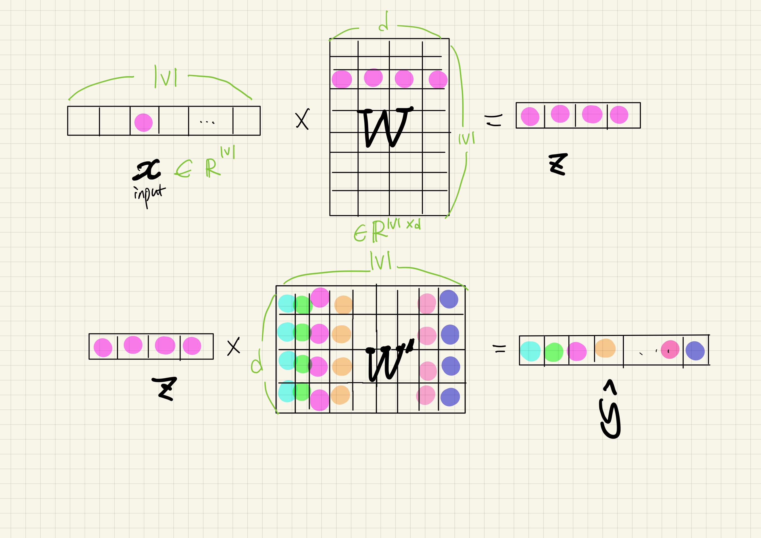 수식을 쓰기 싫어서 그림으로 표현해봤는데, 실제로 인풋(x)는 one-hot vector이기 때문에 해당 단어의 index를 제외하면 모두 0인 sparse한 벡터이다. 따라서 W와 내적을하면 해당 인덱스를 제외하고는 모두 날아간다(dense해진다).