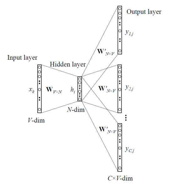 위의 문장 예시에서 Skip-gram이라는 단어가 입력으로 들어가면, This, is, model, . 네 개의 one-hot vector가 출력이 된다.