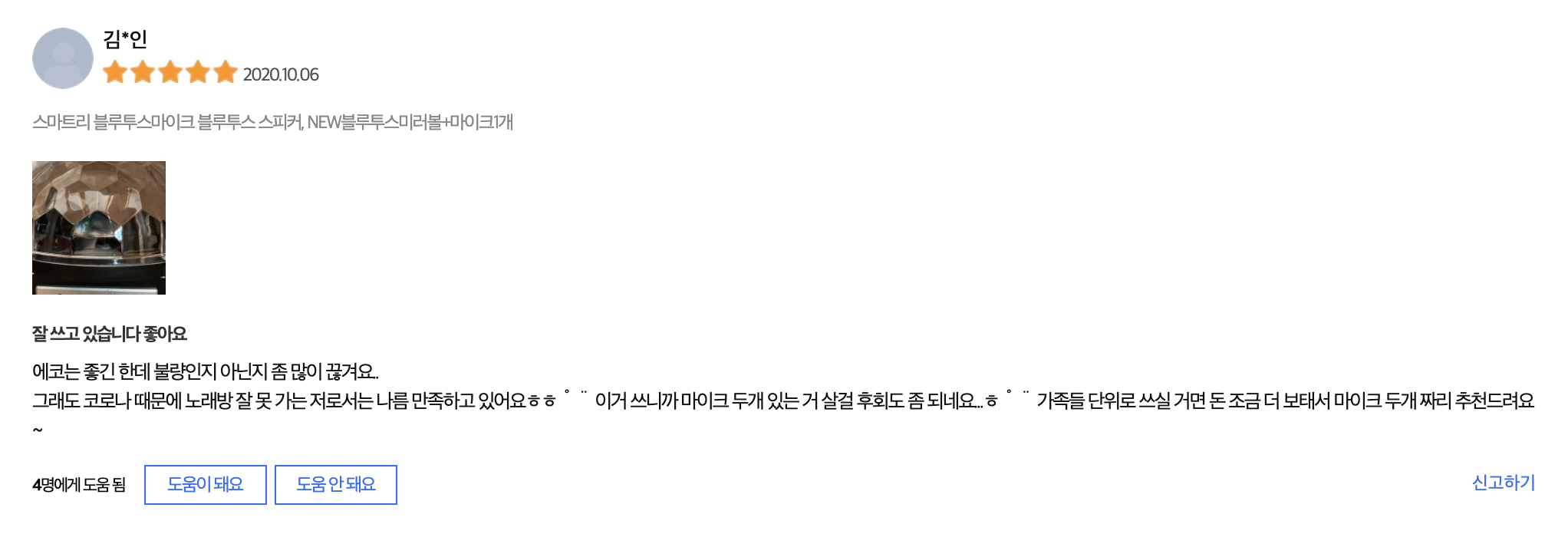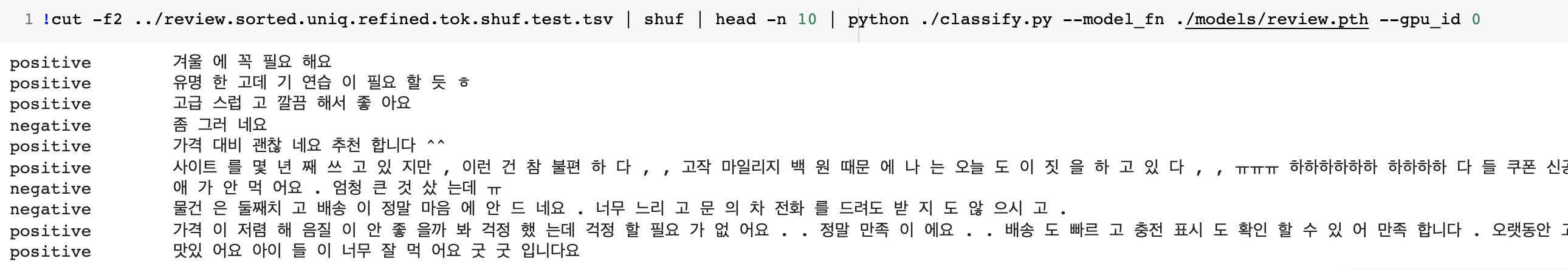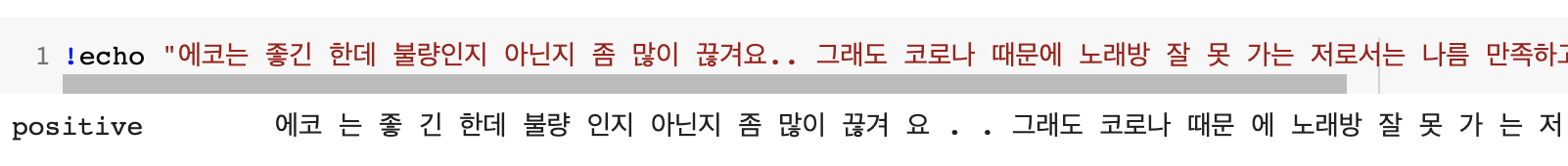 !echo "에코는 좋긴 한데 불량인지 아닌지 좀 많이 끊겨요.. 그래도 코로나 때문에 노래방 잘 못 가는 저로서는 나름 만족하고 있어요ㅎㅎ̊̈ 이거 쓰니까 마이크 두개 있는 거 살걸 후회도 좀 되네요...ㅎ̊̈ 가족들 단위로 쓰실 거면 돈 조금 더 보태서 마이크 두개 짜리 추천드려요~" | mecab -O wakati | python ./classify.py --model_fn ./models/review.pth --gpu_id 0