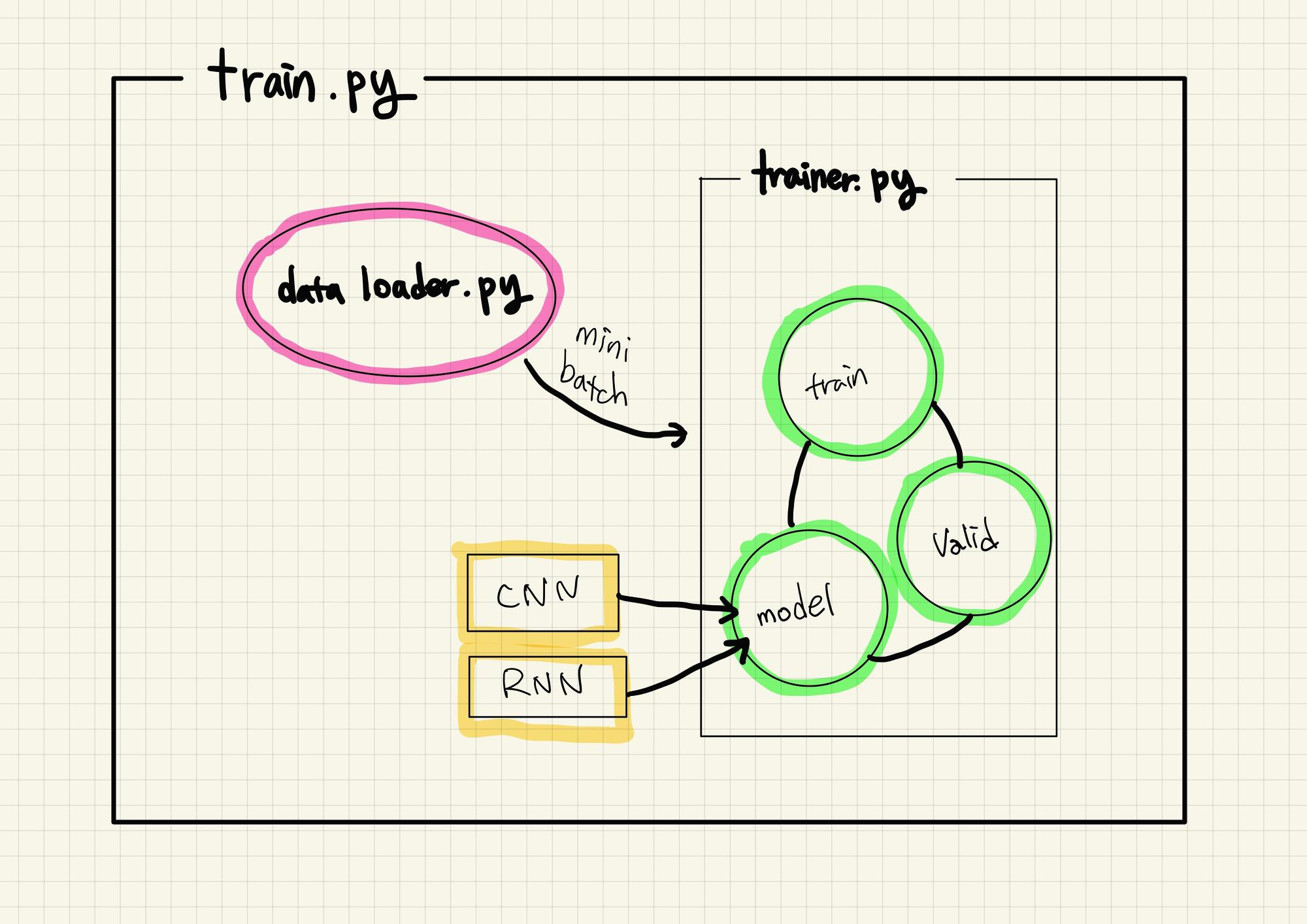 학습을 시키는 trainer는 ignite 패키지를 사용한다. Ignite는 학습 엔진의 프로세스의 시점들의 콜백 함수를 등록할 수 있게 한다. 엔진을 train, valid로 나누어 선언한다. train engine은 feed-forward, loss계산, back-propagation, optimization 등의 일련의 과정을 static 함수로 담고 있다. valid engine은 ff, loss 계산 후 현재 상태를 출력하는 함수가 들어있다. trainer 모듈 내의 check_best 함수는 loss를 계산해서 가장 좋은 모델의 weights를 가지고 있고, save_model 함수를 통해서 저장한다.