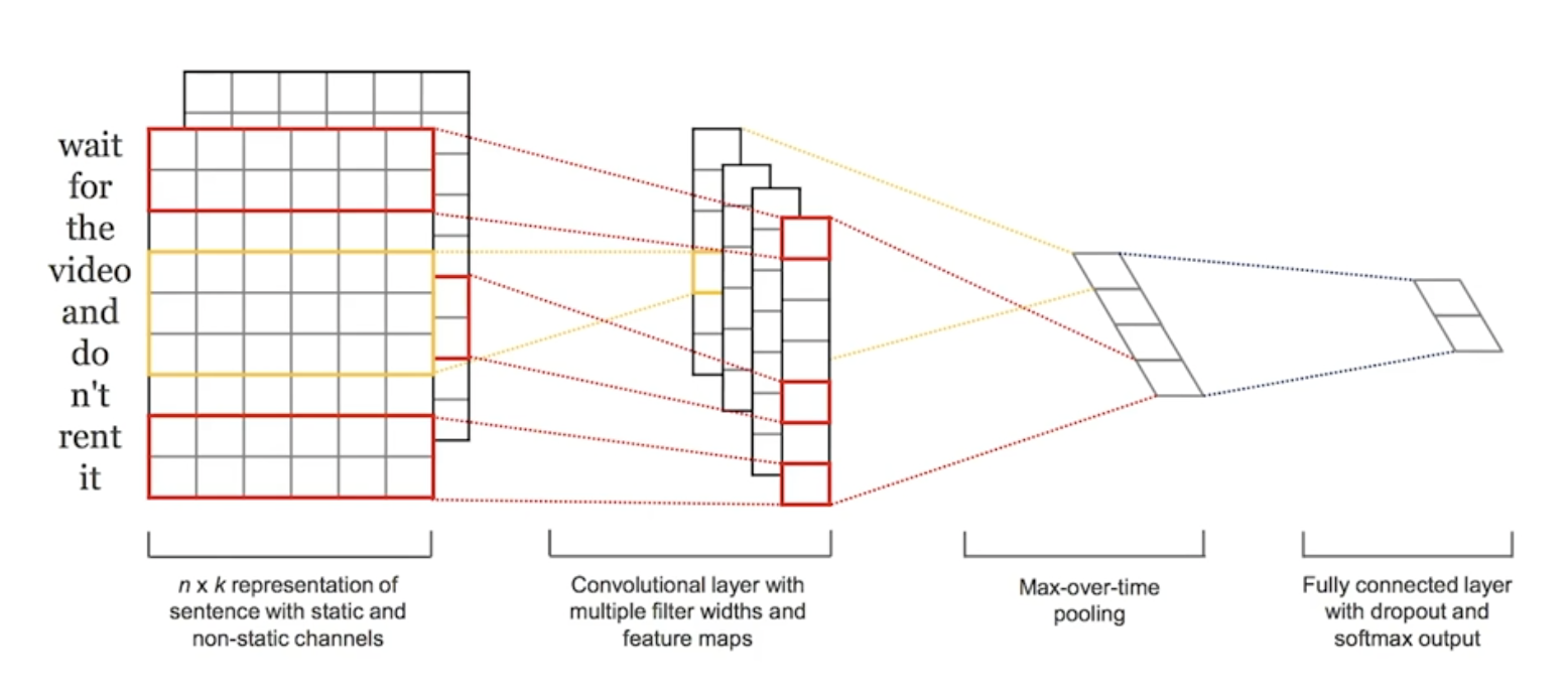 위와 같이 단어들을 묶어서 필터에 통과시켜서 하나의 의미를 가진 벡터(context vector)로 만든다. max pooling layer에서는 각기 다른 길이를 가진 문장들을 일정한 크기의 임베딩 벡터로 변환시켜주고, 그 벡터를 softmax하여 y hat을 구한다. 대신 문장 패턴의 길이는 하이퍼파라미터로 설정해 주어야 한다.