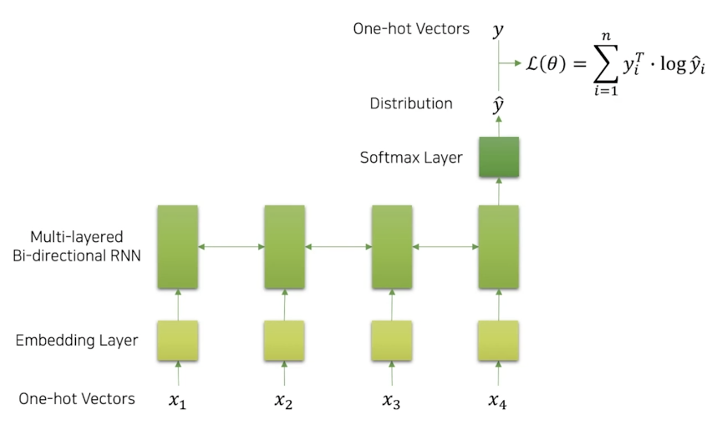 먼저 one-hot vector를 입력으로 받아서 embedding layer에 넣어주고, Bi-directional RNN을 통해 출력을 얻는다. 마지막 time-step값을 softmax layer에 통과시켜 각 클래스별로의 확률값을 얻는다(BPTT). 자연어 생성과는 다르게 auto-regressive가 아니기 때문에, 입력을 한 번에 받고, 모든 time-step을 직렬이 아닌 병렬로 처리가 가능하다. 생각보다 구조가 매우 간단하다.