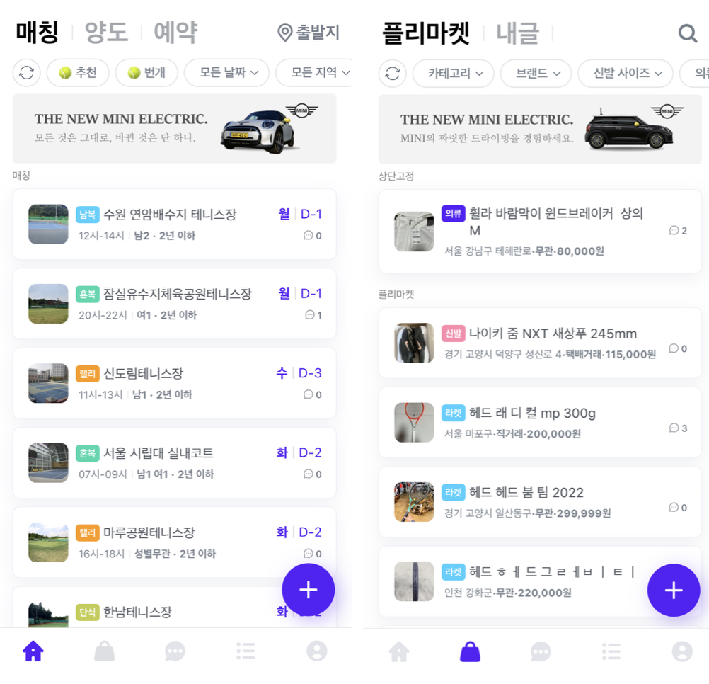 아래처럼 첫 가입시에 내가 자주 방문하는 테니스 클럽들을 기입하고, 간단한 익명 프로필을 작성하면 쉽게 가입할수 있고, 내가 원하는 지역, 날짜, 실력에 맞게 필터링하여 매칭을 구할 수 있다. 크게 매칭(일일게스트) / 양도(코트를 못쓰게되어서 양도) / 예약(테니스장 예약)이 보이는 홈 화면이 있고, 아래의 장바구니 버튼을 누르면 테니스 관련 용품들의 중고장터가 보인다.