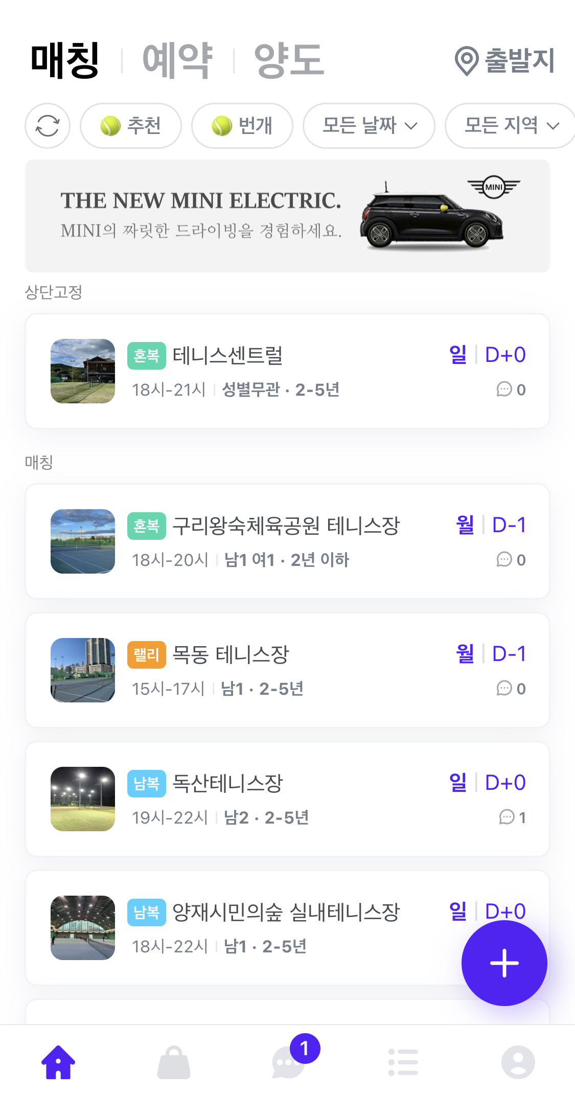 - 최신 순/날짜 임박순/코트 거리순으로 정렬