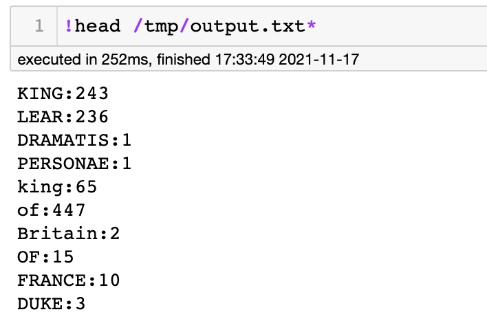 shakespeare/kinglear.txt 예제 데이터를 통해서 워드 카운팅하는 작업을 만들어 보았다.